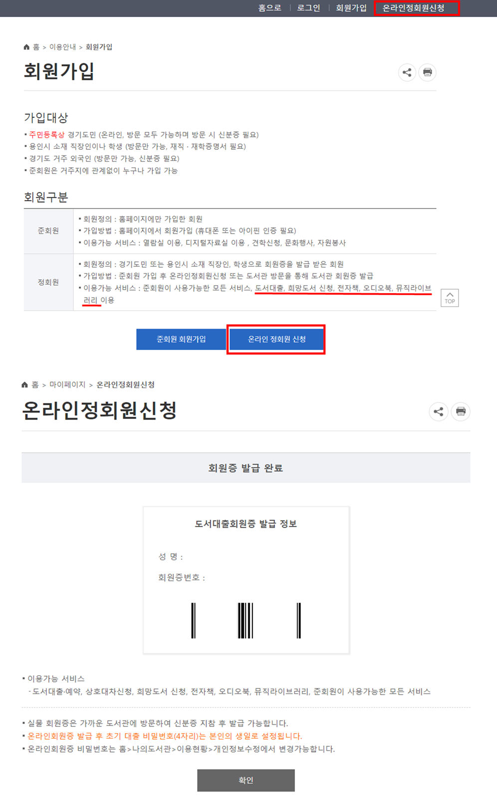 도서관 사이트 상단에 온라인정회원신청을 클릭하고,