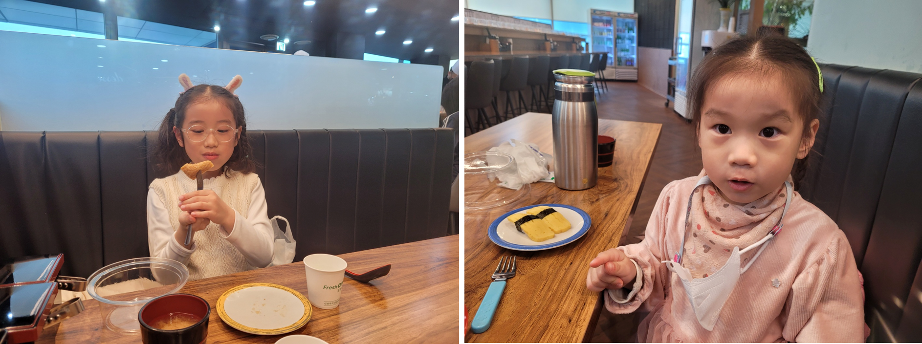 아이들은 우동을 시켜줘야겠다 생각했는데, 처음 먹어본 계란초밥이 맛있었는지
