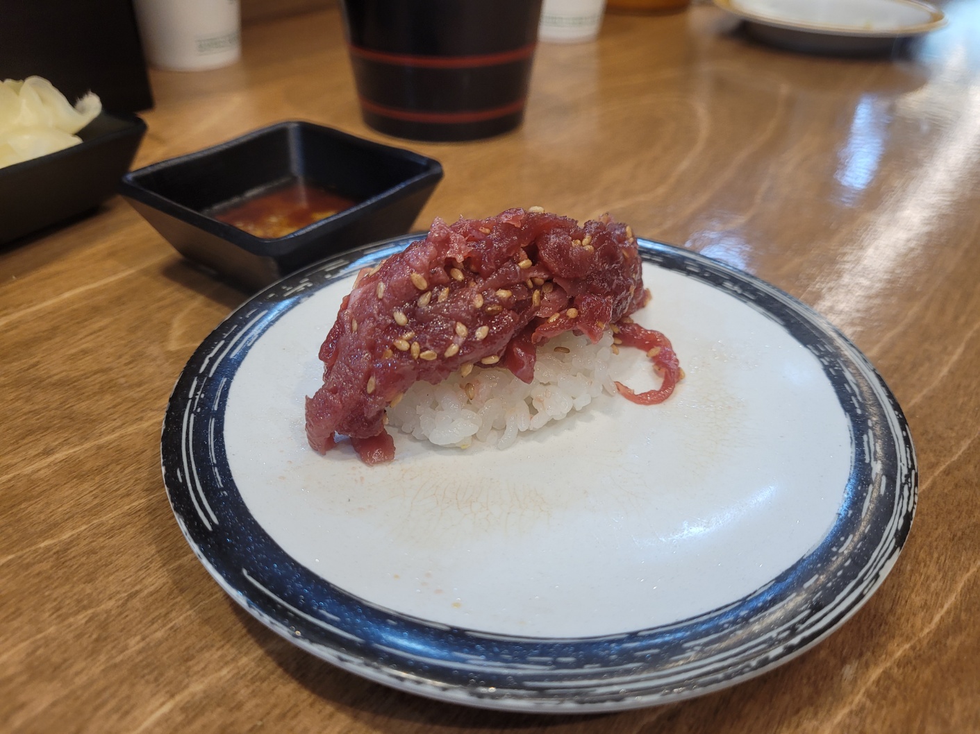 대부분 접시 당 2개씩 올라가 있고, 육회나 새우장 같은 친구들은 한 개씩 올라가 있어요.