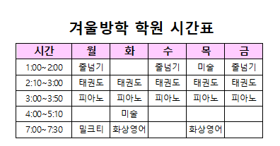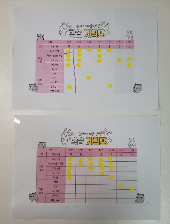 겨울방학을 알차게 보내 보고자 학습계획표를 짜고 활동한 내용을 기록하면서 생활하고 있어요.