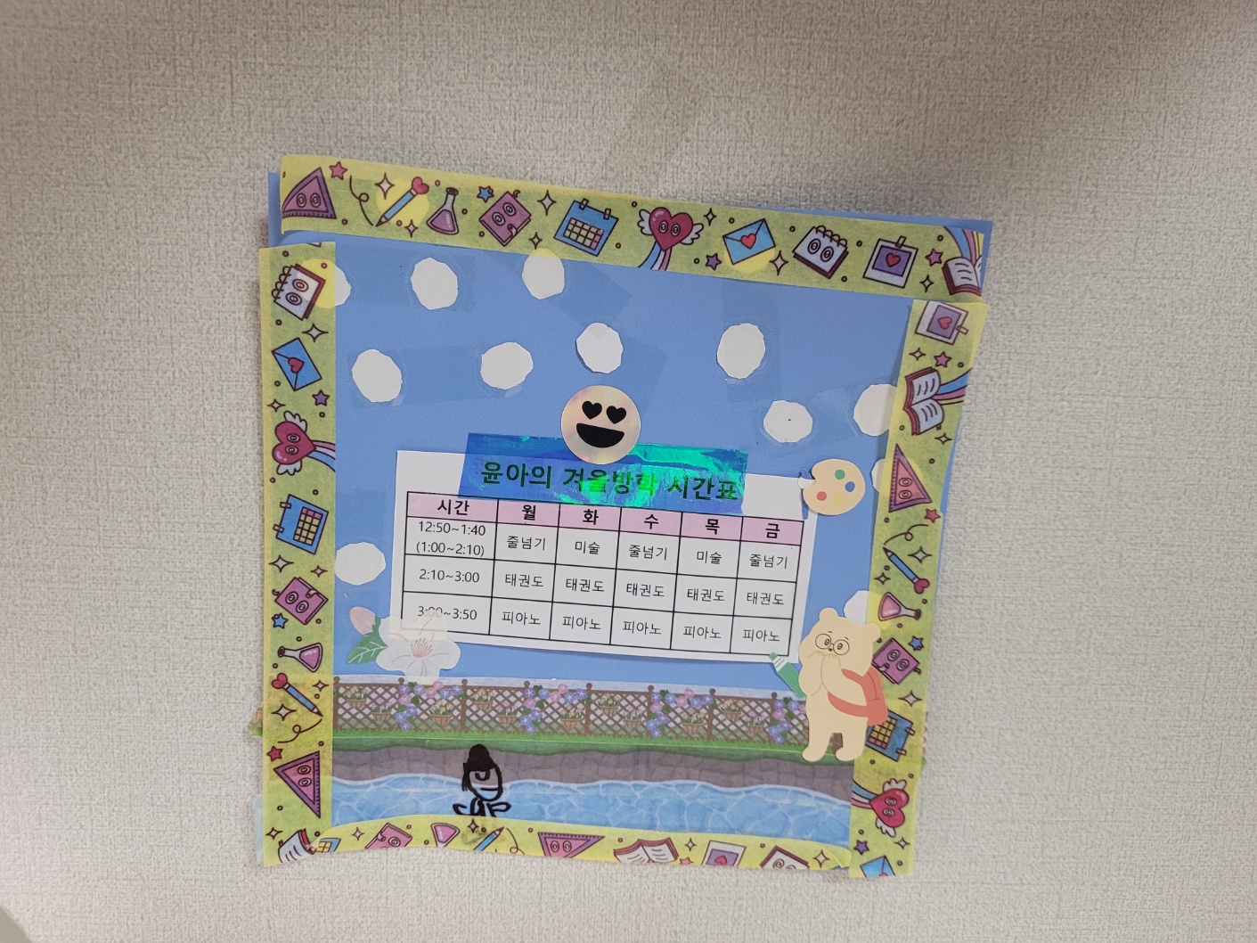 학원시간표는 여러개 인쇄해서 냉장고, 아이 책상, 매일 아이가 들고다니는 수첩에 붙여주었어요.