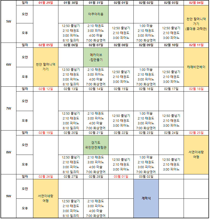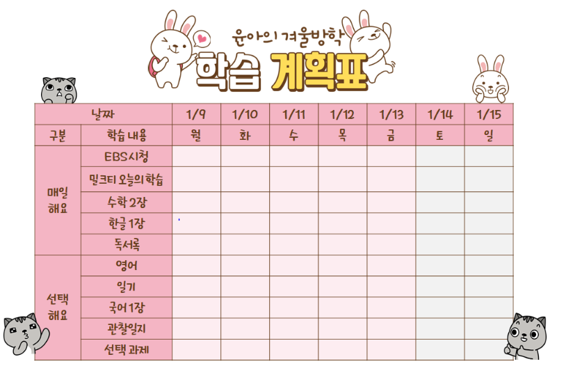 학습계획표 양식과 겨울방학 달력을 첨부했어요.