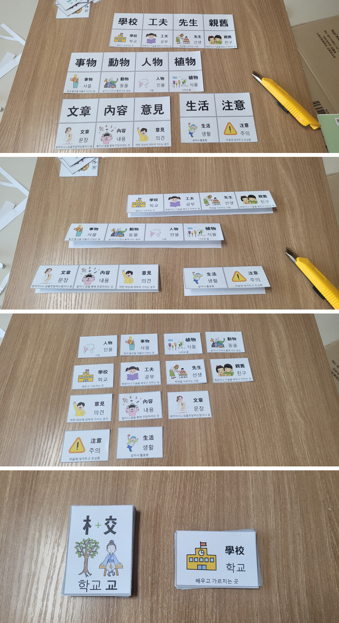 이렇게 교과서 한자어 카드와 단어카드를 완성했어요.
