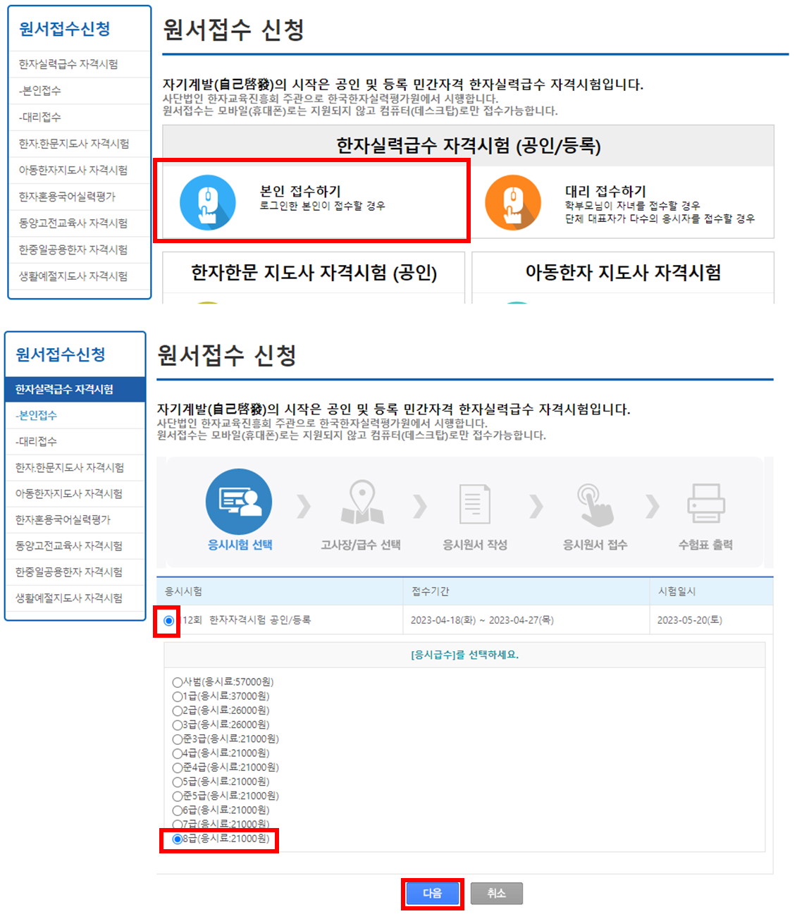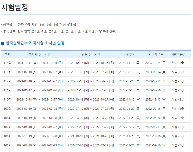 먼저 시험일정부터 말씀드리면 4/18 화요일부터 4/27일 목요일까지 한자교육 진흥회에서 주관하는 한자실력급수