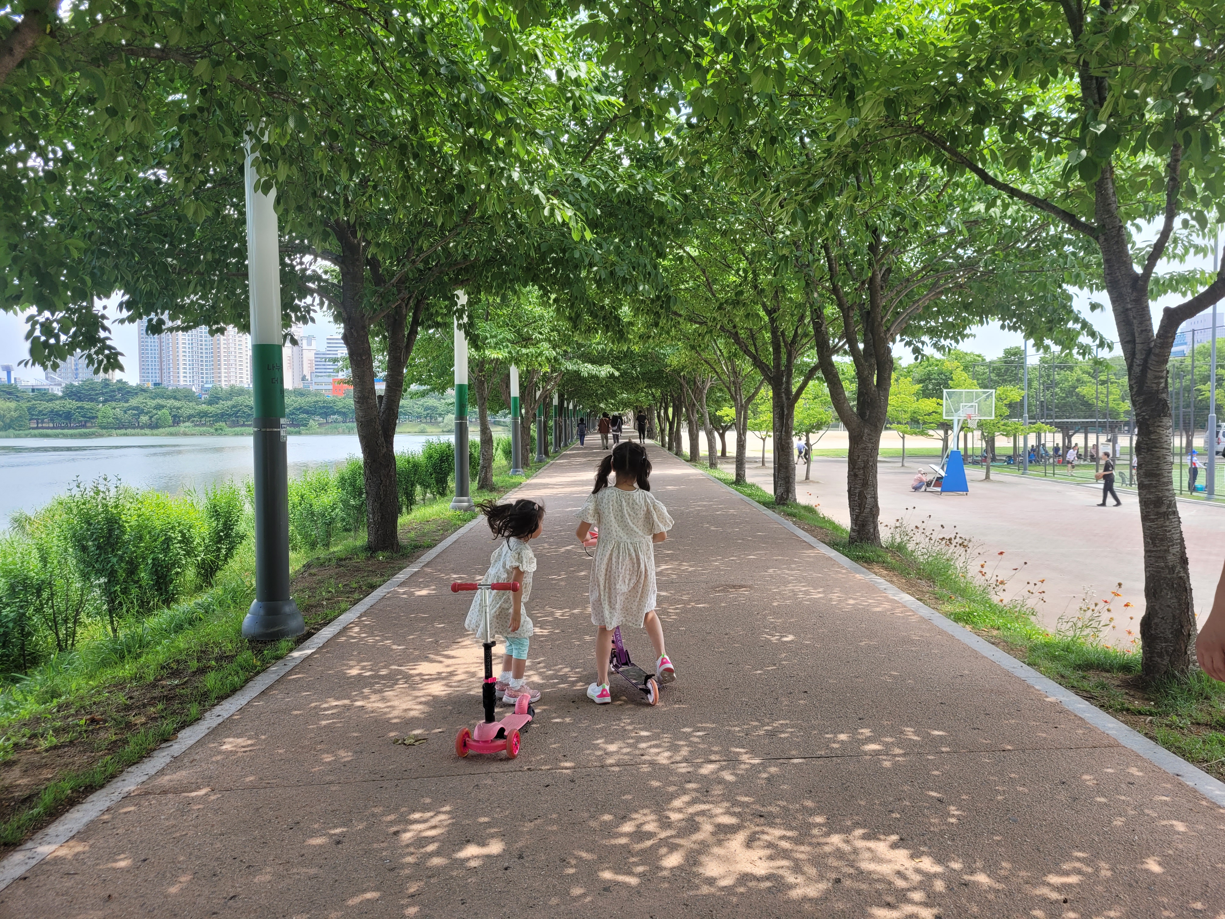미술대회 참석을 위해 이동 중입니다. 내부가 35만 m2로 꽤 넓은 편이고 1300m의 둘레길이 조성되어 있어요. 저희는 미술대회 정 반대쪽에 주차를 해서 둘레길을 따라 한참 올라가야 했어요. 킥보드가 없었으면 애들과 걸어가기 힘들 뻔했습니다.