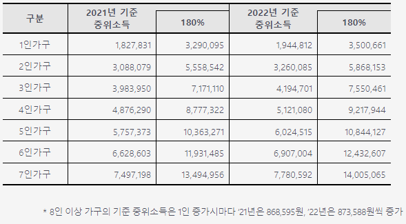 - 가구소득: 가구원 수에 따른 기준 중위소득 180% 이하
