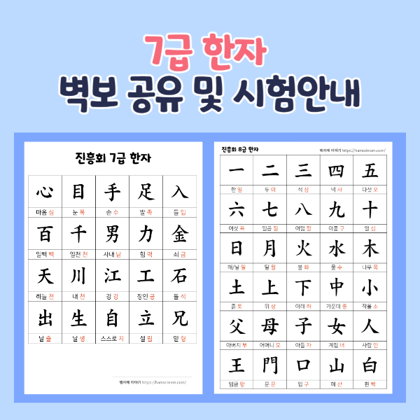 진흥회 한자 7급 안내 및 7급 한자 벽보 공유(대상한자, 기출문제)